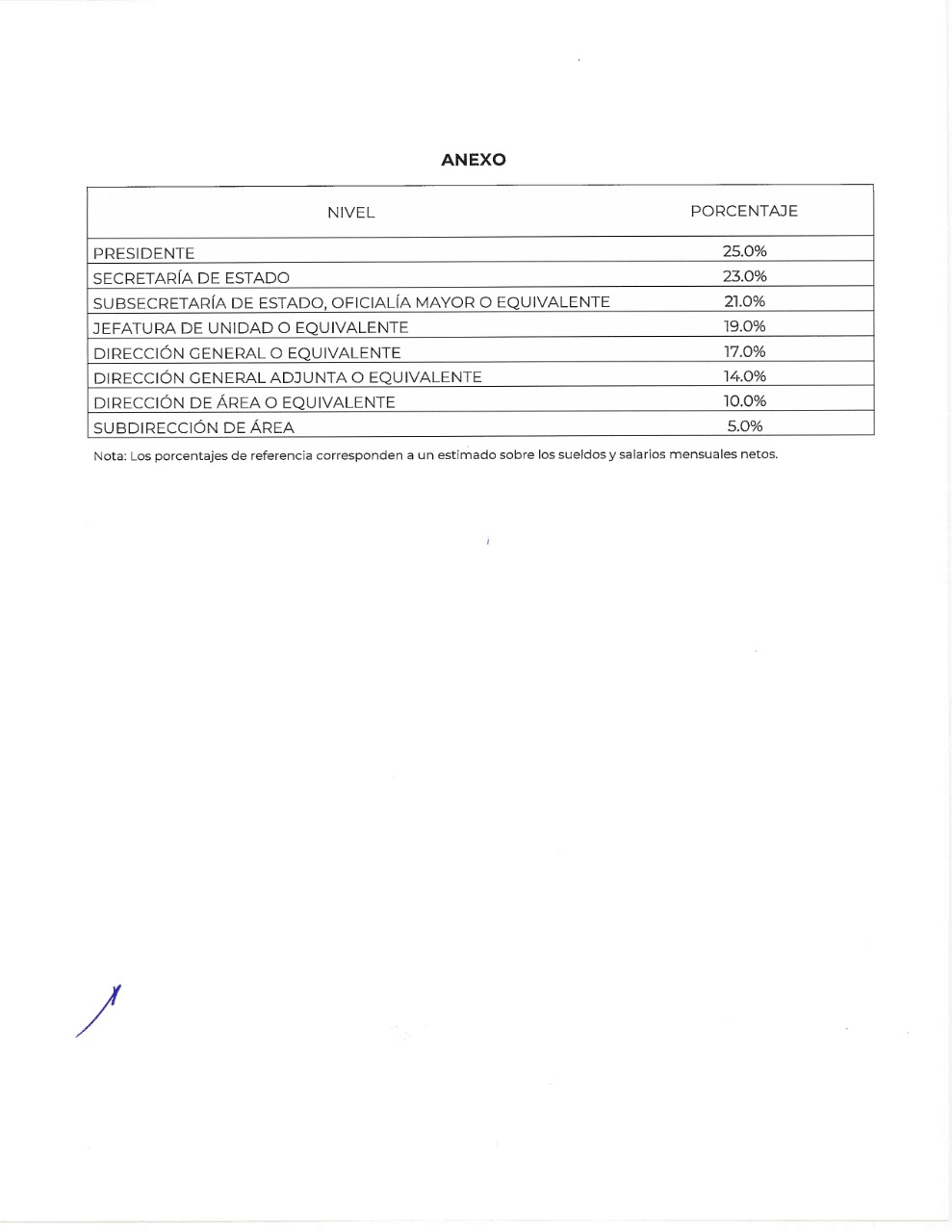 En un oficio firmado por Thalía Concepción Lagunas Aragón, detalla que esta medida está dirigida a los servidores públicos con nivel de subdirector al presidente de la República y detalla porcentajes que van de cinco al 25 por ciento.